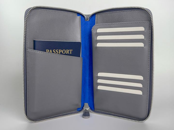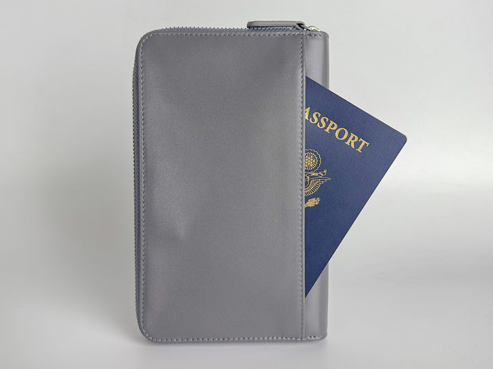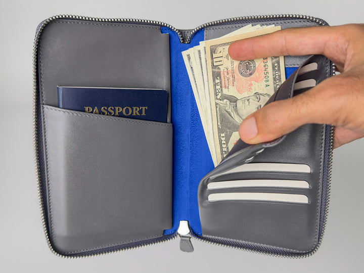 Dedicated passport slot on the left side, with an additional pocket below for folded documents or receipts.